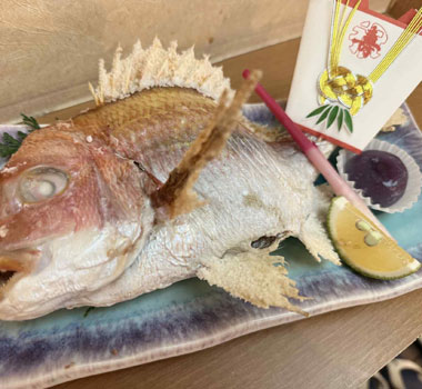お料理もどれも素晴らしく、お食い初めに欠かせない鯛をはじめ、立派なお膳に盛り付けられたお料理の数々に感動しました。その一つひとつの料理に込められた意味を丁寧にご案内いただき、感謝の気持ちでいっぱいです。